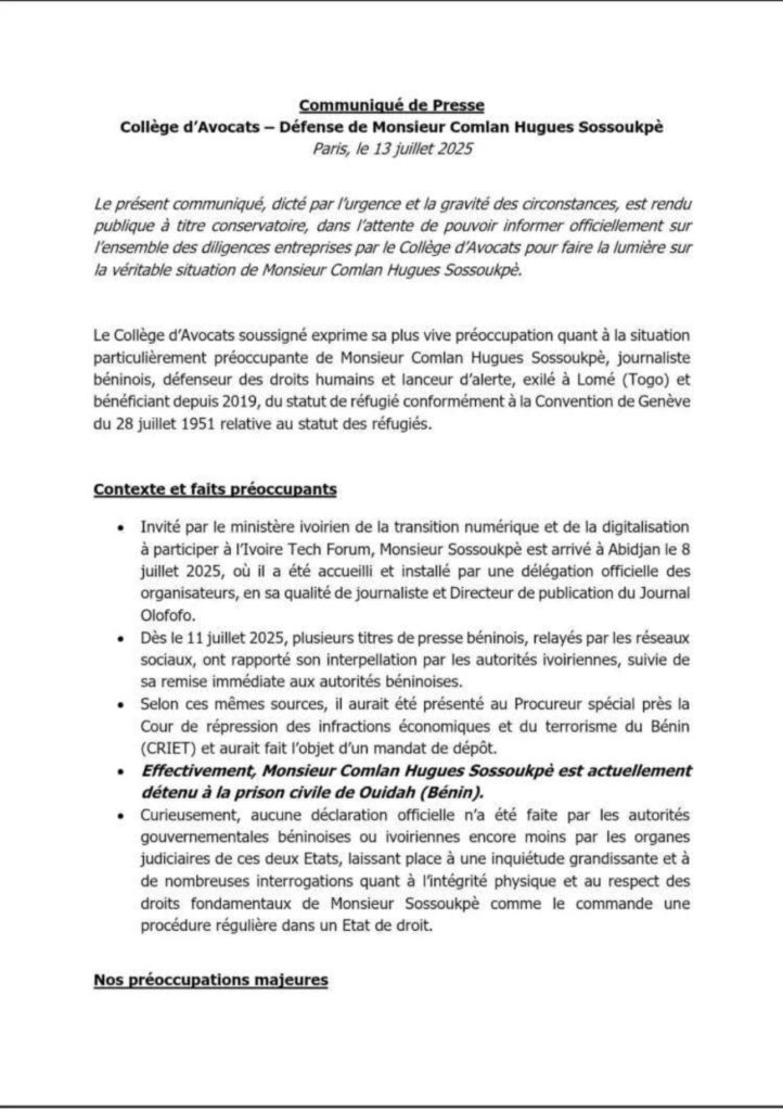 Le présent communiqué, dicté par l’urgence et la gravité des circonstances, est rendu publique à titre conservatoire, dans l’attente de pouvoir informer officiellement sur l’ensemble des diligences entreprises par le Collège d’Avocats pour faire la lumière sur la véritable situation de Monsieur Comlan Hugues Sossoukpè.
