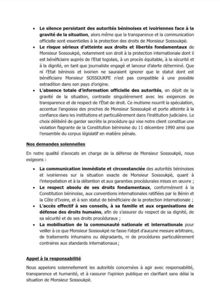 Le silence persistant des autorités béninoises et ivoiriennes face à la gravité de la situation, alors même que la transparence et la communication officielle sont essentielles à la protection des droits de Monsieur Sossoukpè. • Le risque sérieux d’atteinte aux droits et libertés fondamentaux de Monsieur Sossoukpè, notamment son droit à la protection internationale dont il est bénéficiaire auprès de l’Etat togolais, à un procès équitable, à la sécurité et à la dignité, en tant que journaliste engagé et lanceur d’alerte déterminé. Que ni l’Etat béninois et ivoirien ne sauraient ignorer que le statut dont est bénéficiaire Monsieur SOSSOUKPE n’est pas compatible à une possible extradition dans son pays d’origine.